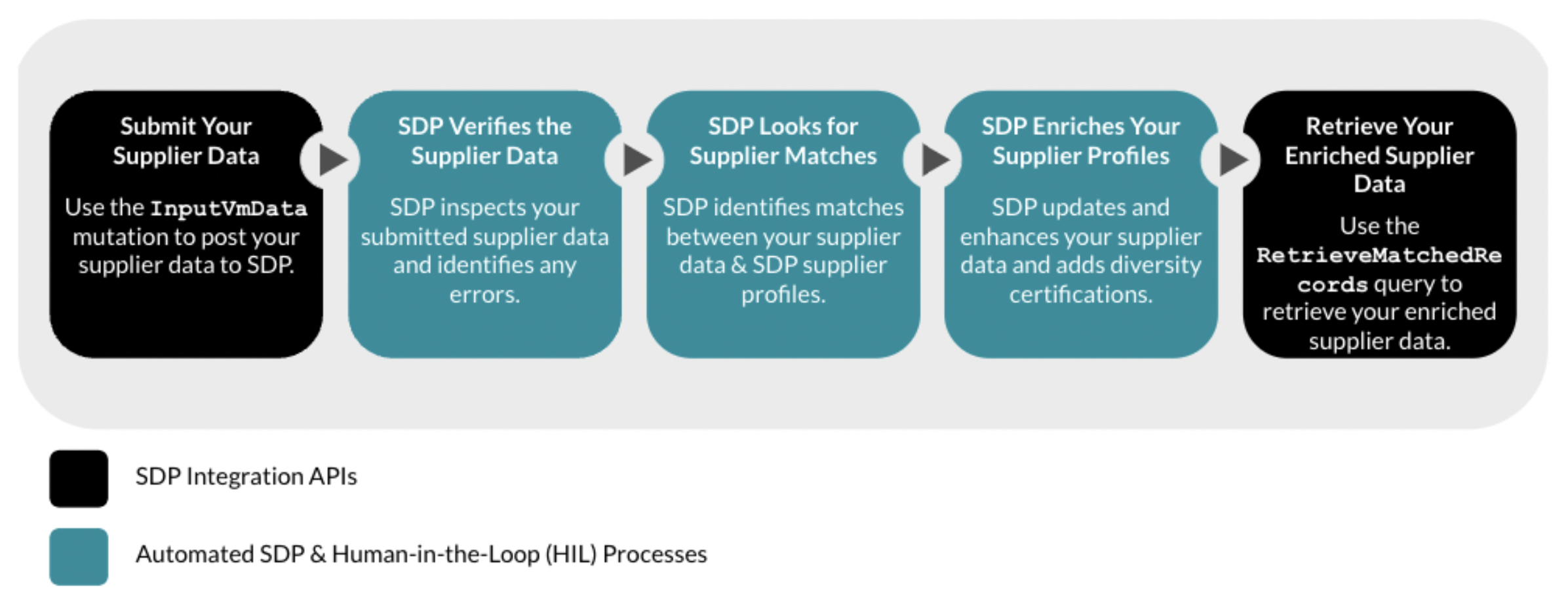 The following diagram illustrates the steps in the Supplier Enrichment process. To initiate this process, submit your supplier data using the inputVmData mutation or upload your vendor master file via the SDP User Console.
